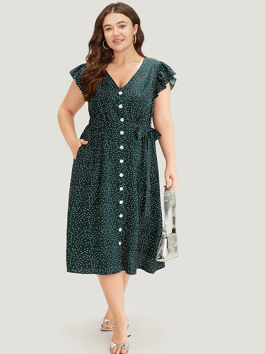 Polka Dot Flutter Trim Button Detail Belted Dress