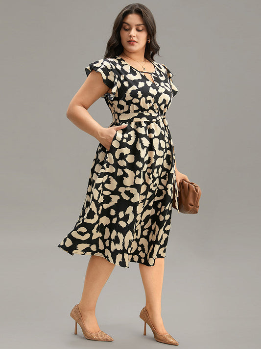 Graphic Print Keyhole Pocket Belted Flutter Trim Dress
