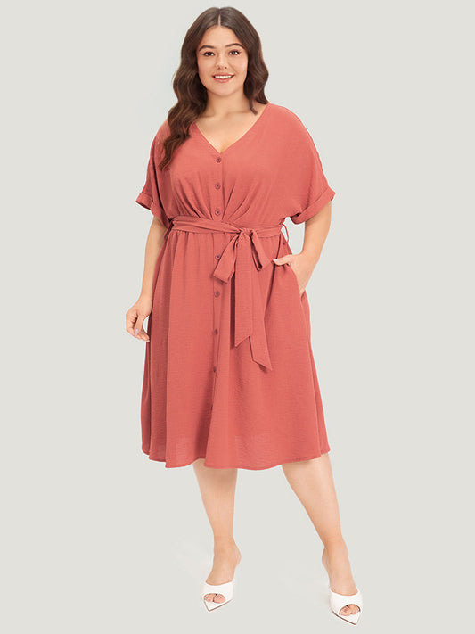 Solid Pocket Button Detail Ties Roll Sleeve Dress