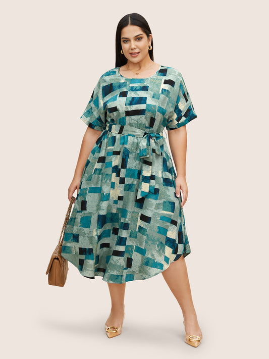 Geometric Belted Dolman Sleeve Curved Hem Dress