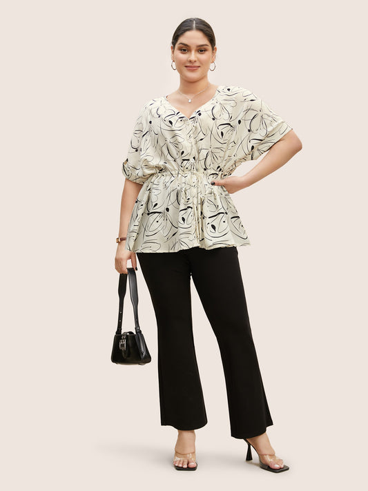 Geometric Print Drawstring Cuffed Sleeve Blouse