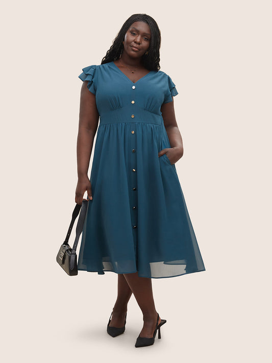 Chiffon Button Detail Tiered Ruffle Cap Sleeve Dress