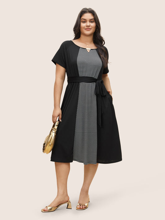 Striped Patchwork Keyhole Belted Raglan Sleeve Dress