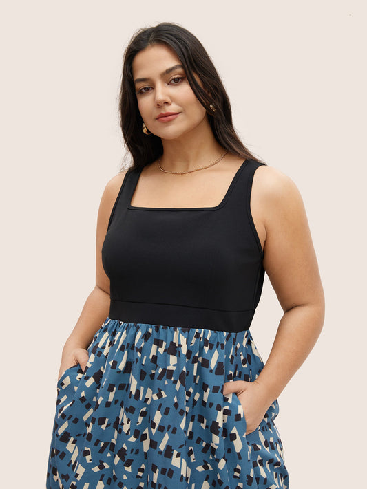 Geometric Patchwork Square Neck Pocket Dress