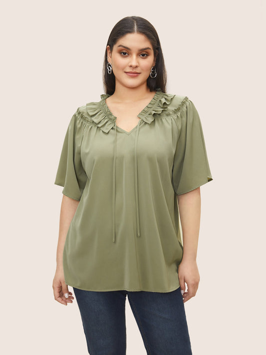Plain Frill Trim Gathered Ruffle Sleeve Blouse