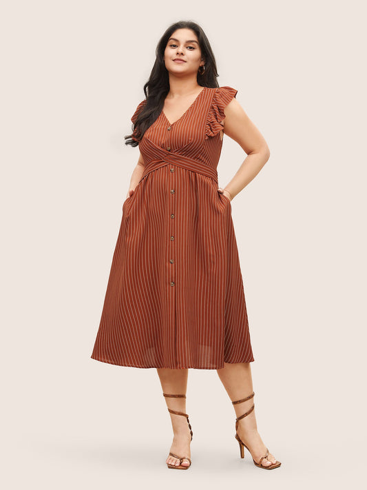 Striped Ruffle Cap Sleeve Button Detail Dress