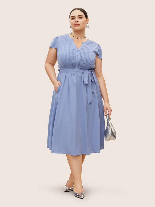 Plain Pleated Button Detail Cap Sleeve Dress