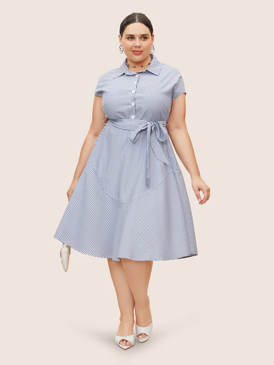 Shirt Collar Striped Cap Sleeve Dress
