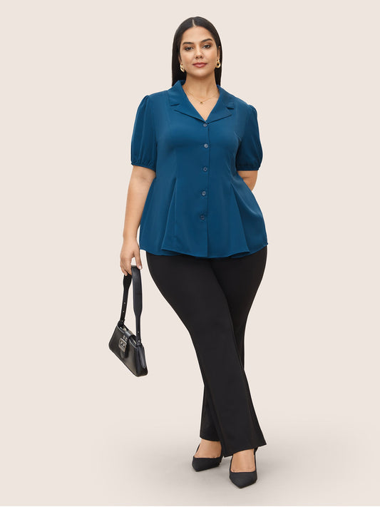 Solid Suit Collar Pleated Puff Sleeve Blouse