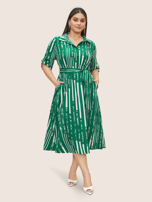 Geometric Shirt Collar Tab Sleeve Belted Dress