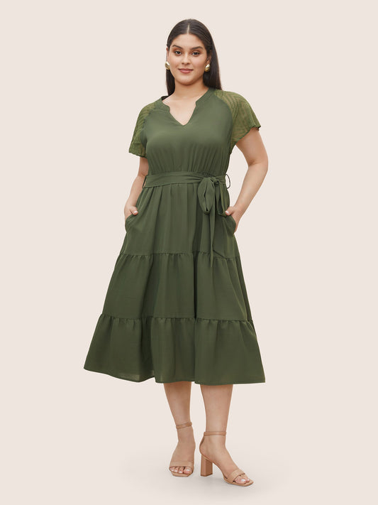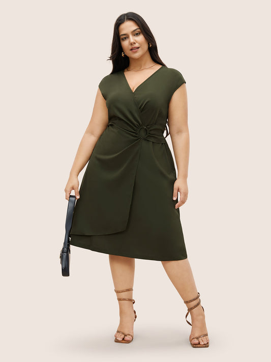 Plain Buckle Detail Overlap Collar Cap Sleeve Dress