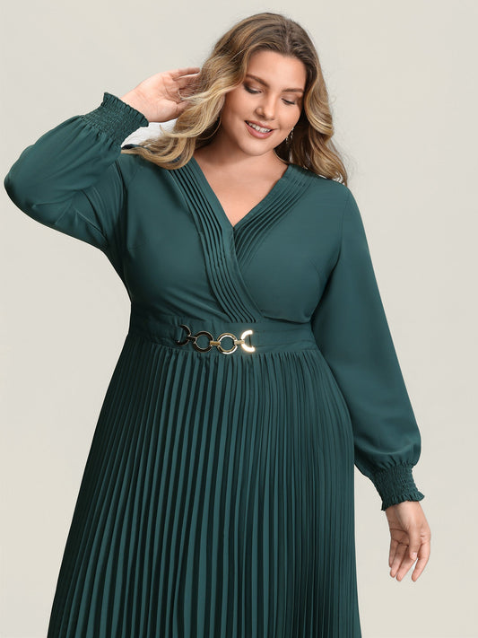 Pleated Wrap Neckline Shirred Waist Midi Dress