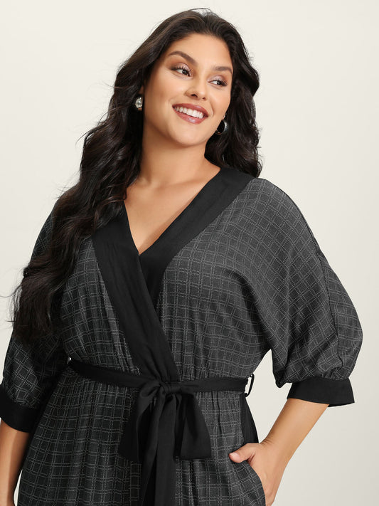 Stretchy Rayon Plaid Pockets Belt Jumpsuit