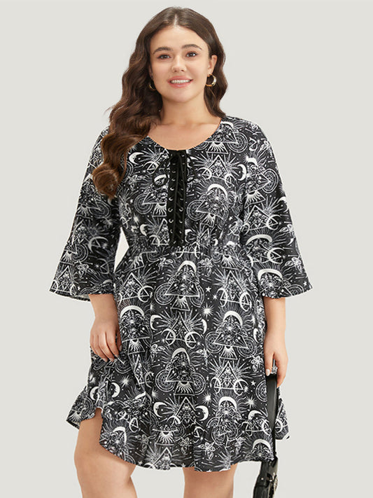 Halloween Moon & Star Lace Up Pocket Bell Sleeve Dress