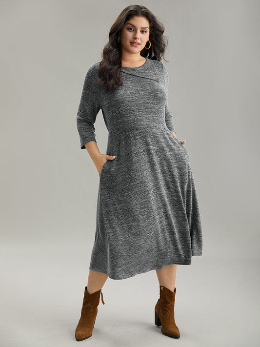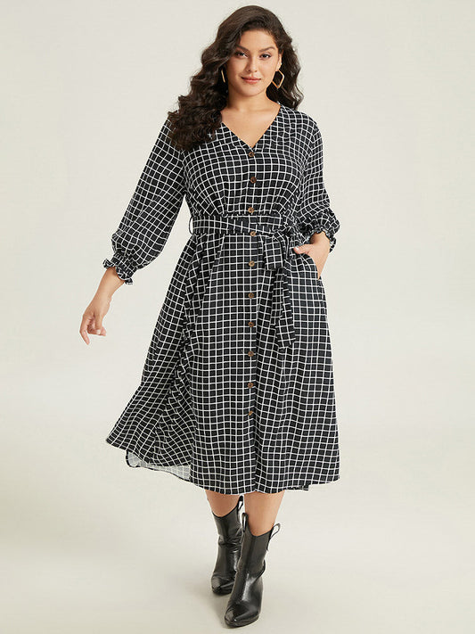 Gingham Button Detail Pocket Lantern Sleeve Dress
