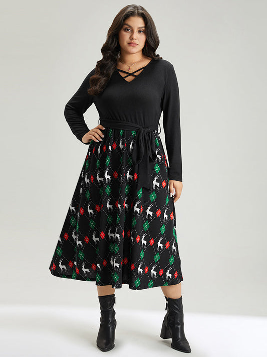 Christmas Elk Crisscross Belted Pocket Dress