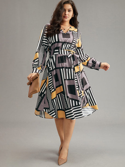 Colorblock Geometric Notched Elastic Waist Arc Hem Dress