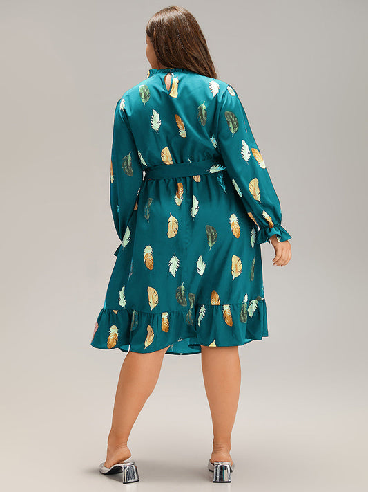 Feather Print Frill Trim Belted Ruffle Hem Dress