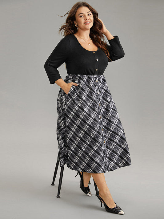 Plaid Patchwork Scoop Neck Button Detail Dress