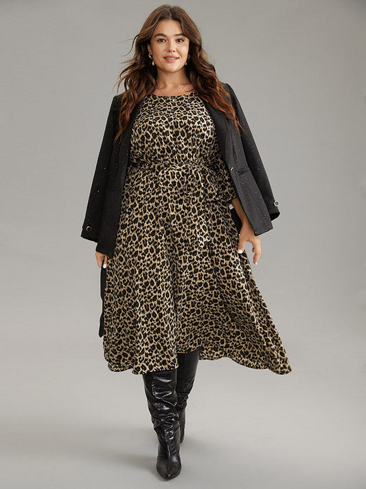 Leopard Elastic Waist Belted Round Neck Dress