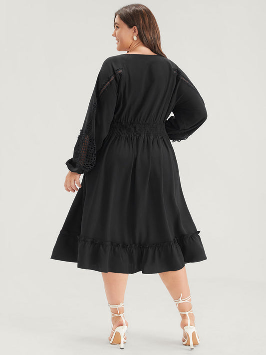 Solid Pocket Crochet Lace Lantern Sleeve Ruffle Shirred Midi Dress