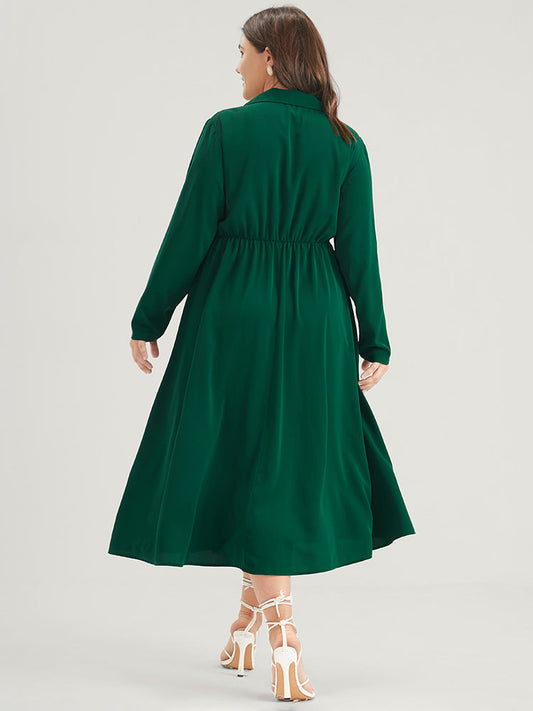Solid Fake Pocket Button Shirt Collar Drawstring Knee Dress