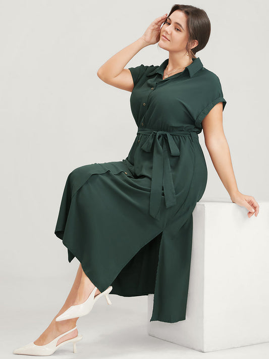 Solid Button Cuffed Sleeve Belted Split Midi Dress