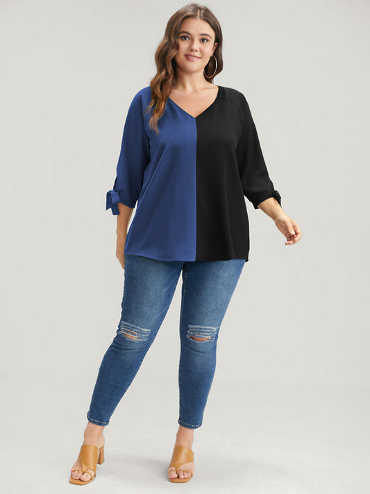 Colorblock Contrast Knotted Sleeve V Neck Blouse