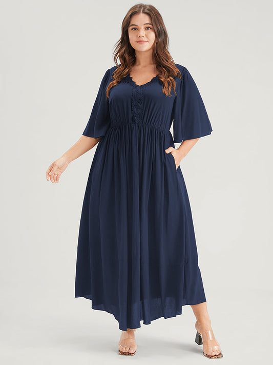 Solid Pocket Eyelet Lace Ruffled Asymmetrical Hem Maxi Dress
