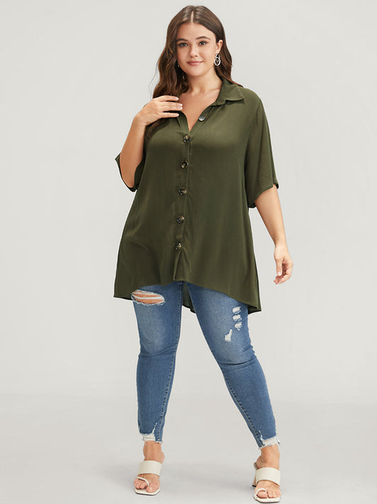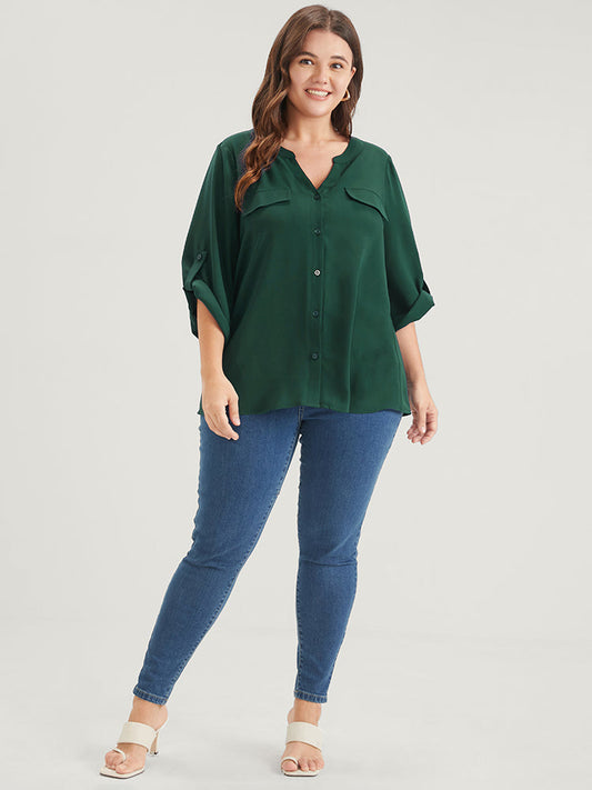 Solid Button Cuffed Sleeve Fake Pocket Blouse