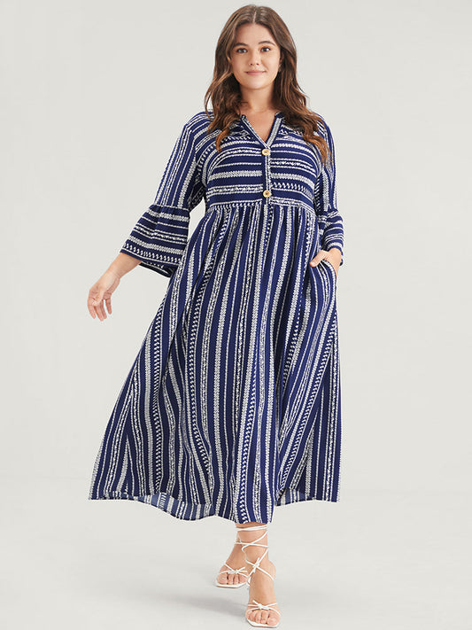 Striped Ruffles Button Pocket Bell Sleeve Maxi Dress