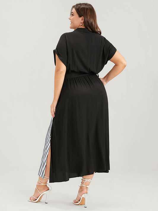 Striped Pocket Dolman Sleeve Button Split Hem Belted Dress