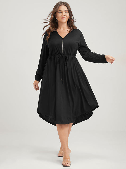 Solid Zipper Pocket Flutter Drawstring Asymmetrical Hem Dress