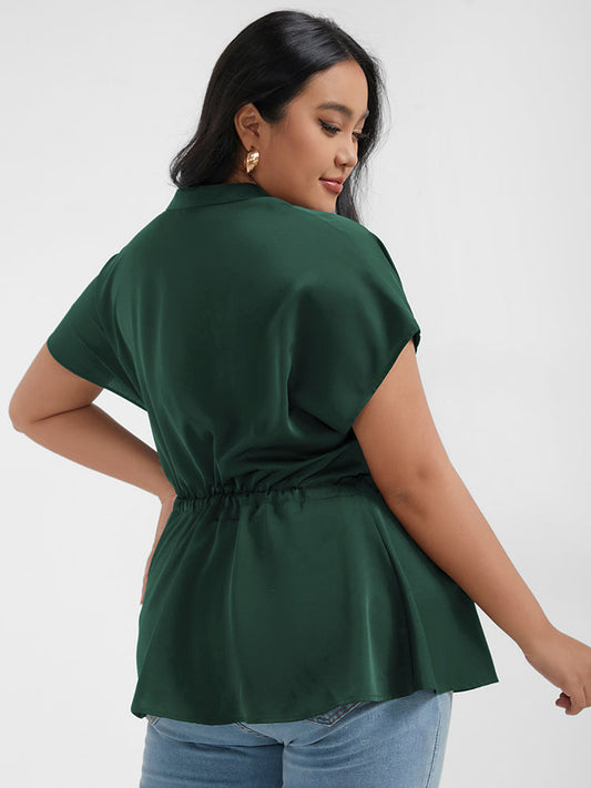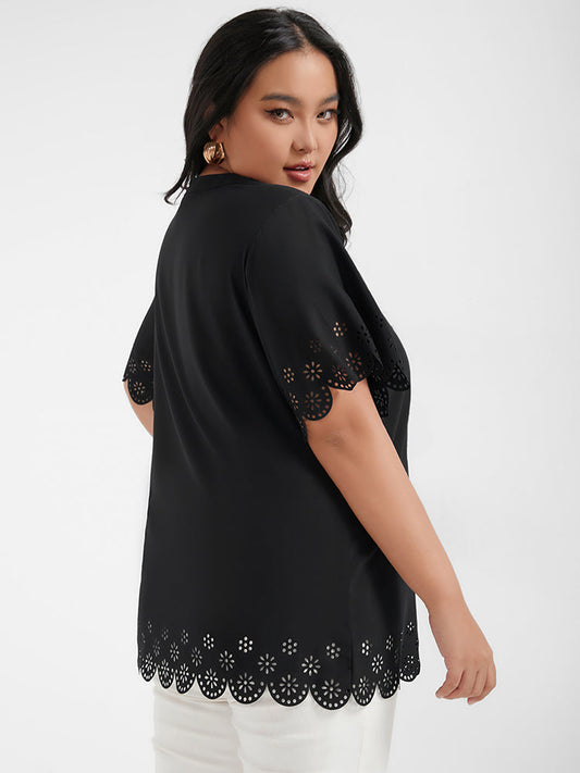 Solid Zipper Broderie Anglaise V Neck Blouse