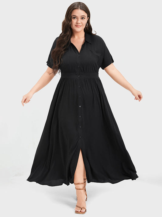 Solid Button Up Ties Pocket Lapel Collar Maxi Dress