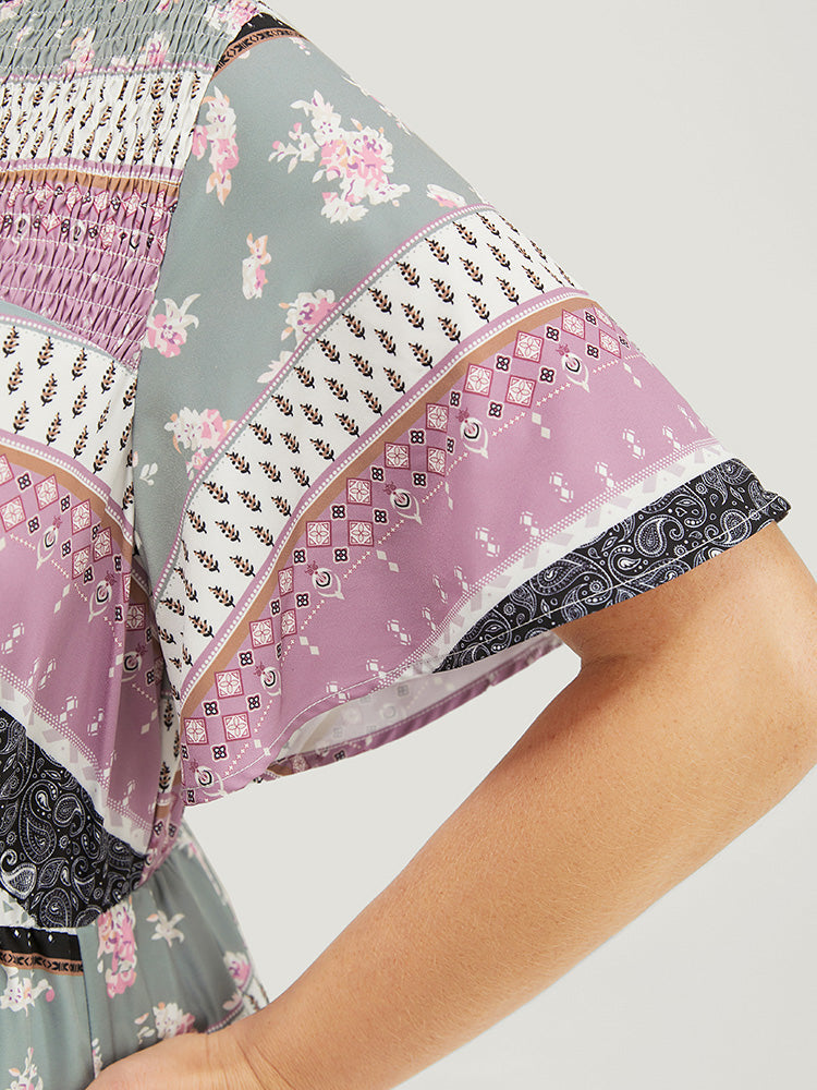 Bandana Print Cut Out Tie Neck Pocket Shirred Striped Dress