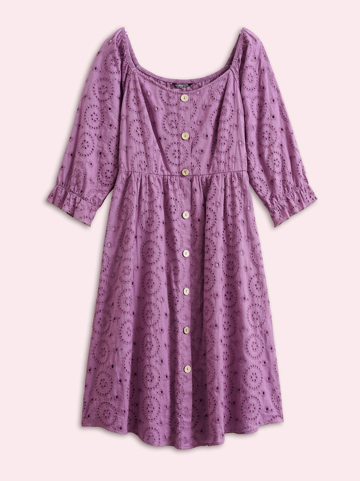 Broderie Anglaise Gathered Square Neck Button Detail Dress