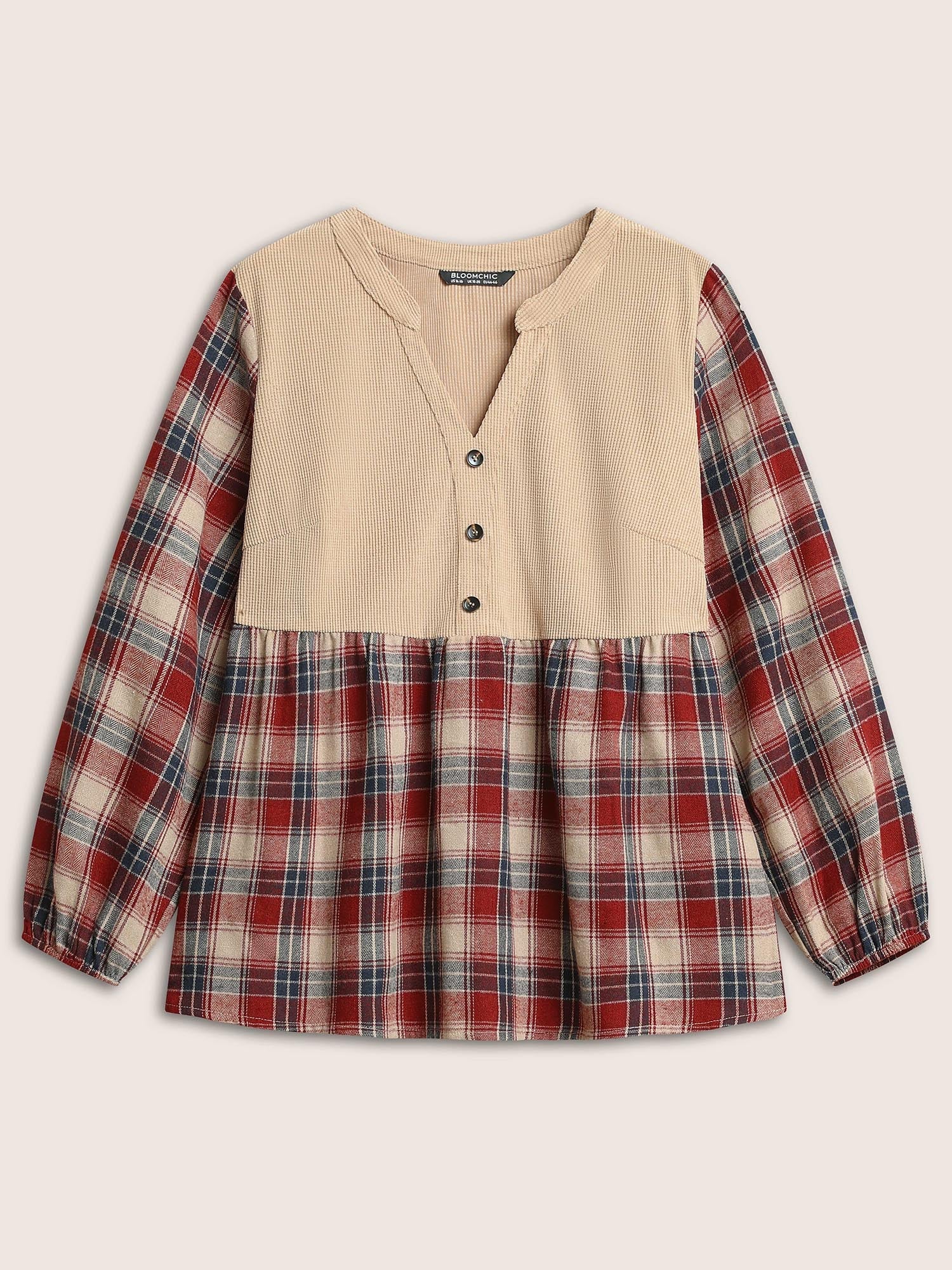 Corduroy Patchwork Plaid Notched Button Detail Blouse