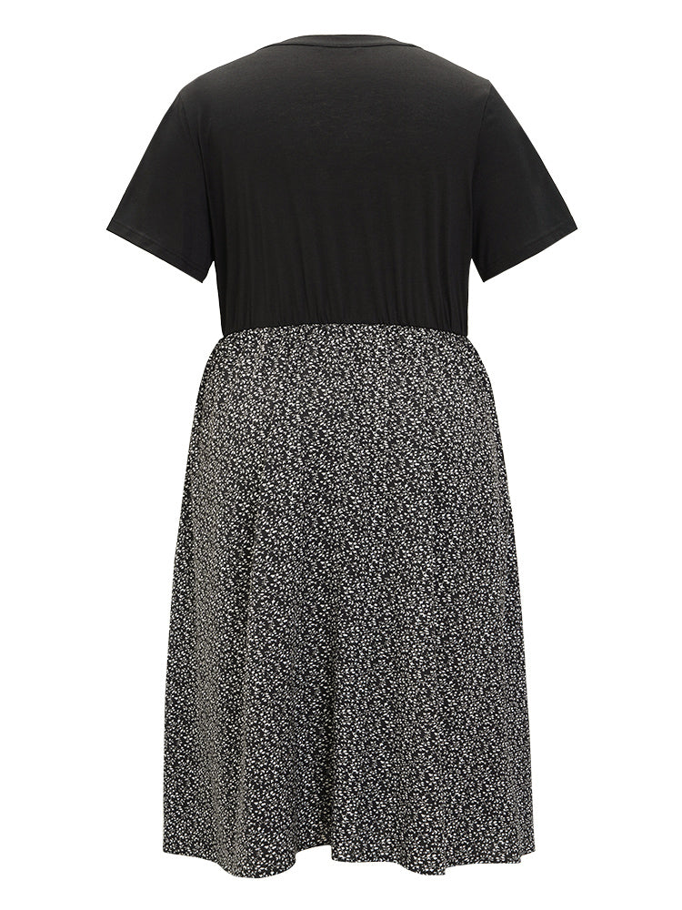 Ditsy Floral Patchwork Notched Pocket Button Detail Ruffle Hem Dress
