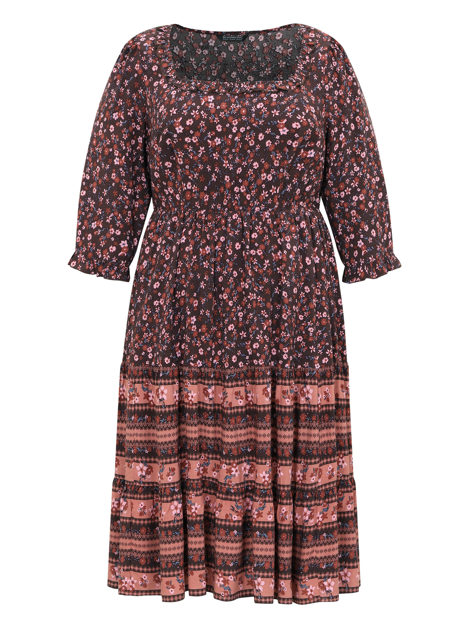 Ditsy Floral Patchwork Square Neck Frill Trim Dress