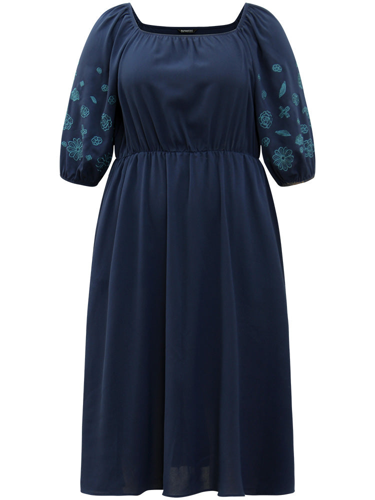 Floral Embroidered Pocket Square Neck Lantern Sleeve Dress