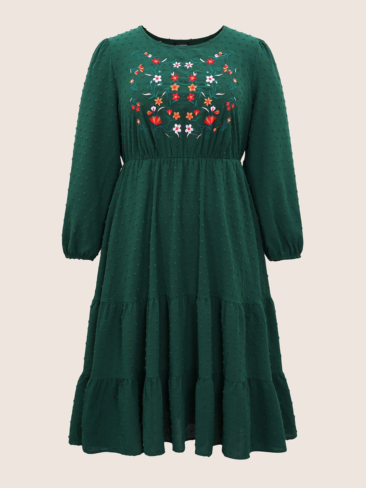 Floral Embroidered Textured Ruffle Layered Hem Dress