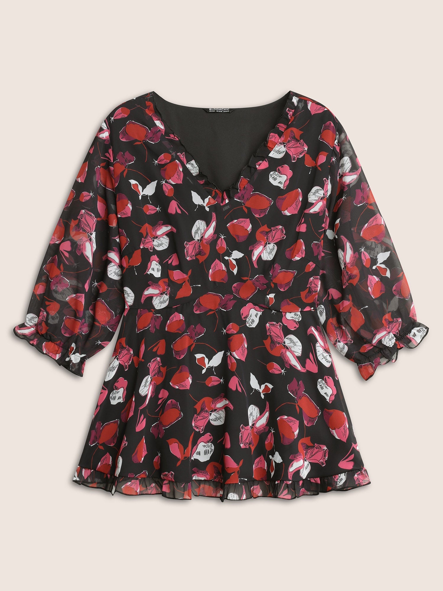 Floral Mesh Patchwork Ruffle Trim Blouse