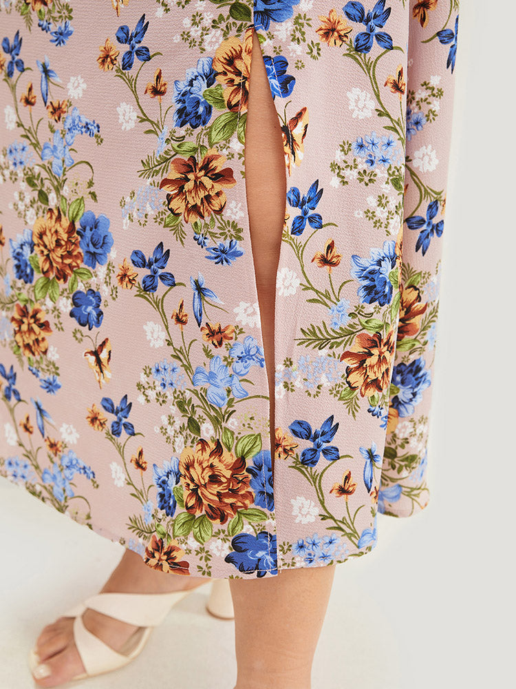 Floral Pocket Lace Insert Split Pompom Trim Halter Dress