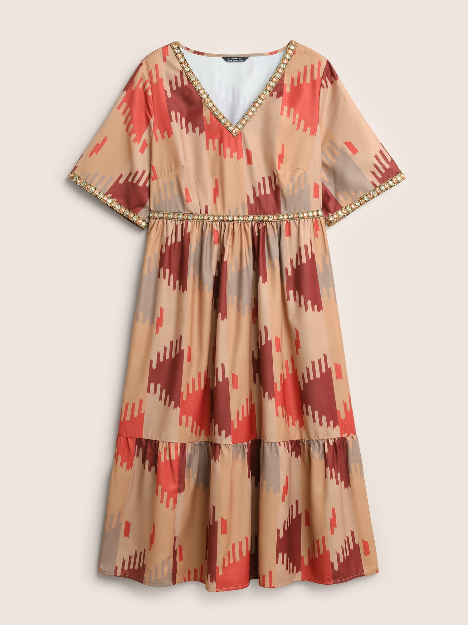 Geometric Contrast Embroidered Elastic Waist Dress