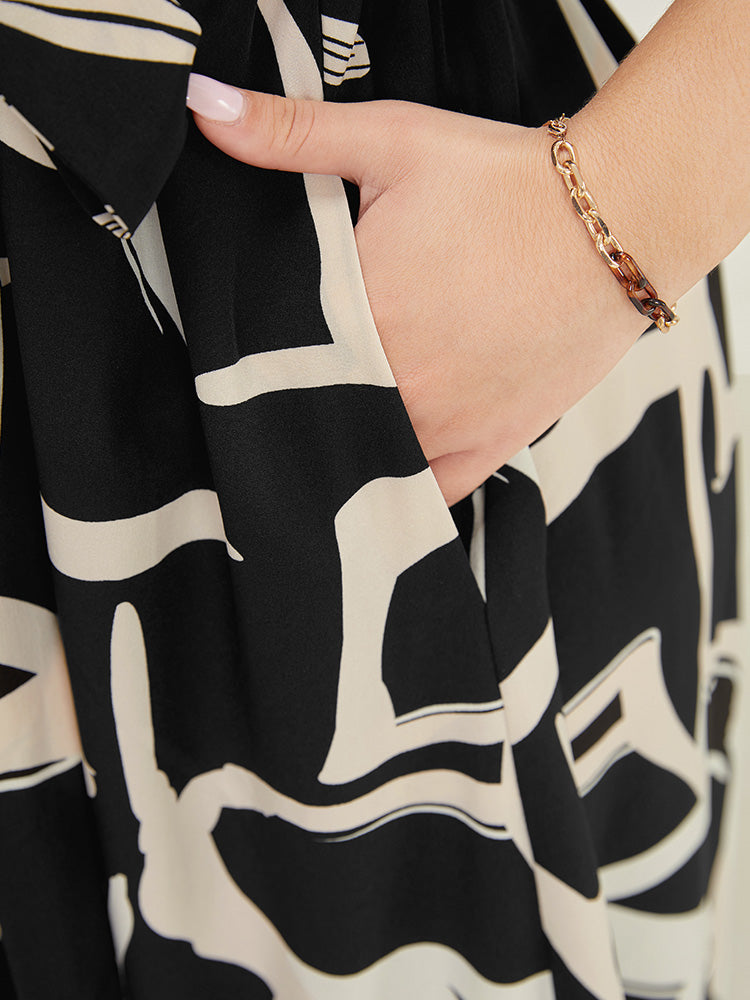Geometric Patchwork Pocket Belt Square Neck Ruffles Dress
