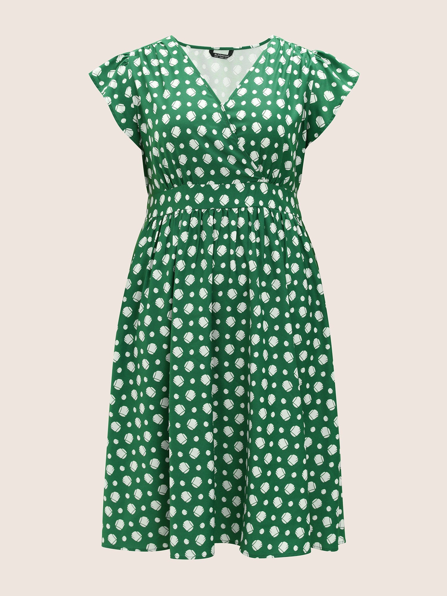 Graphic Wrap Gathered Ruffle Cap Sleeve Dress