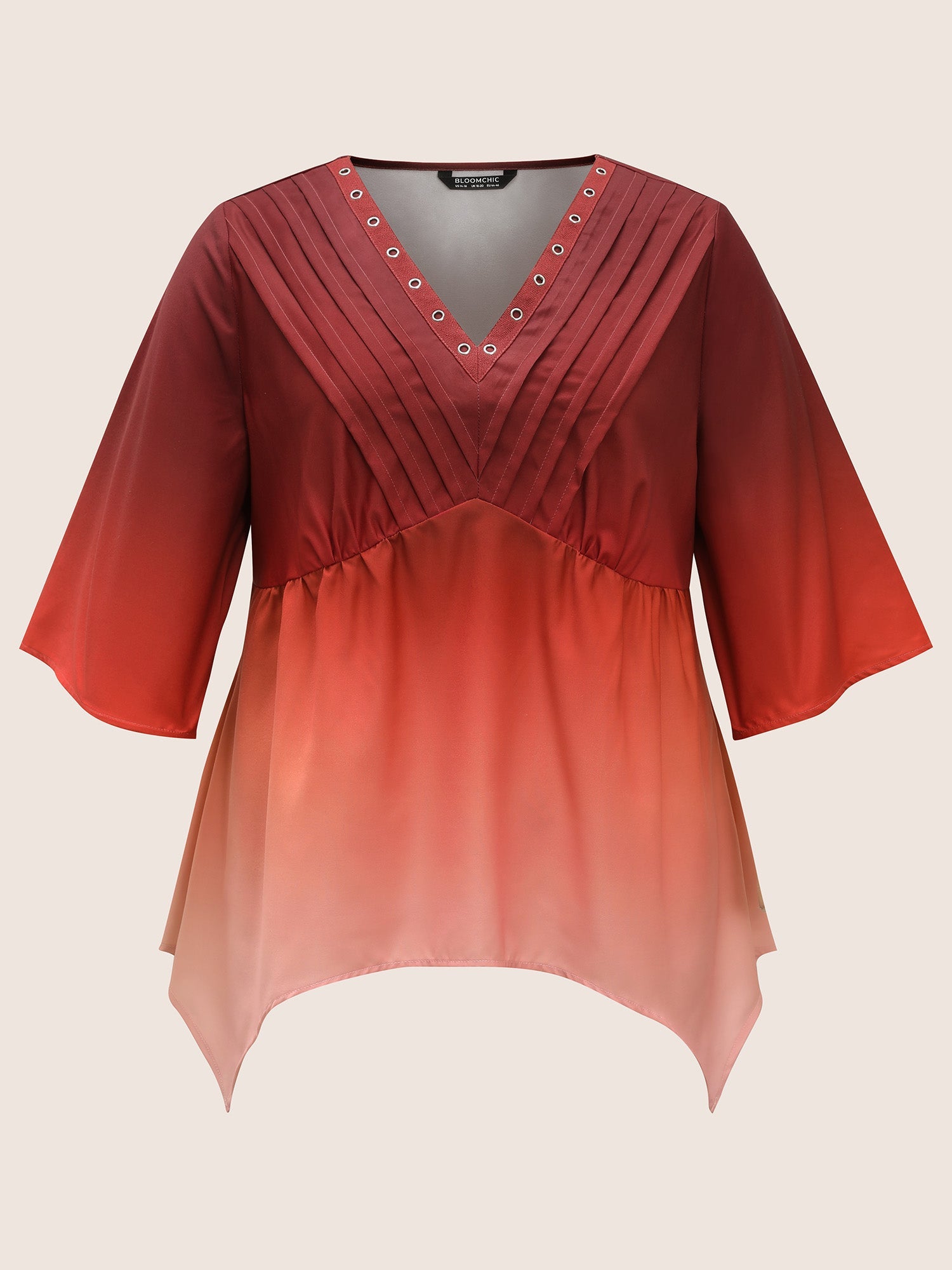 Ombre Pleated Ruffle Sleeve Asymmetrical Hem Blouse