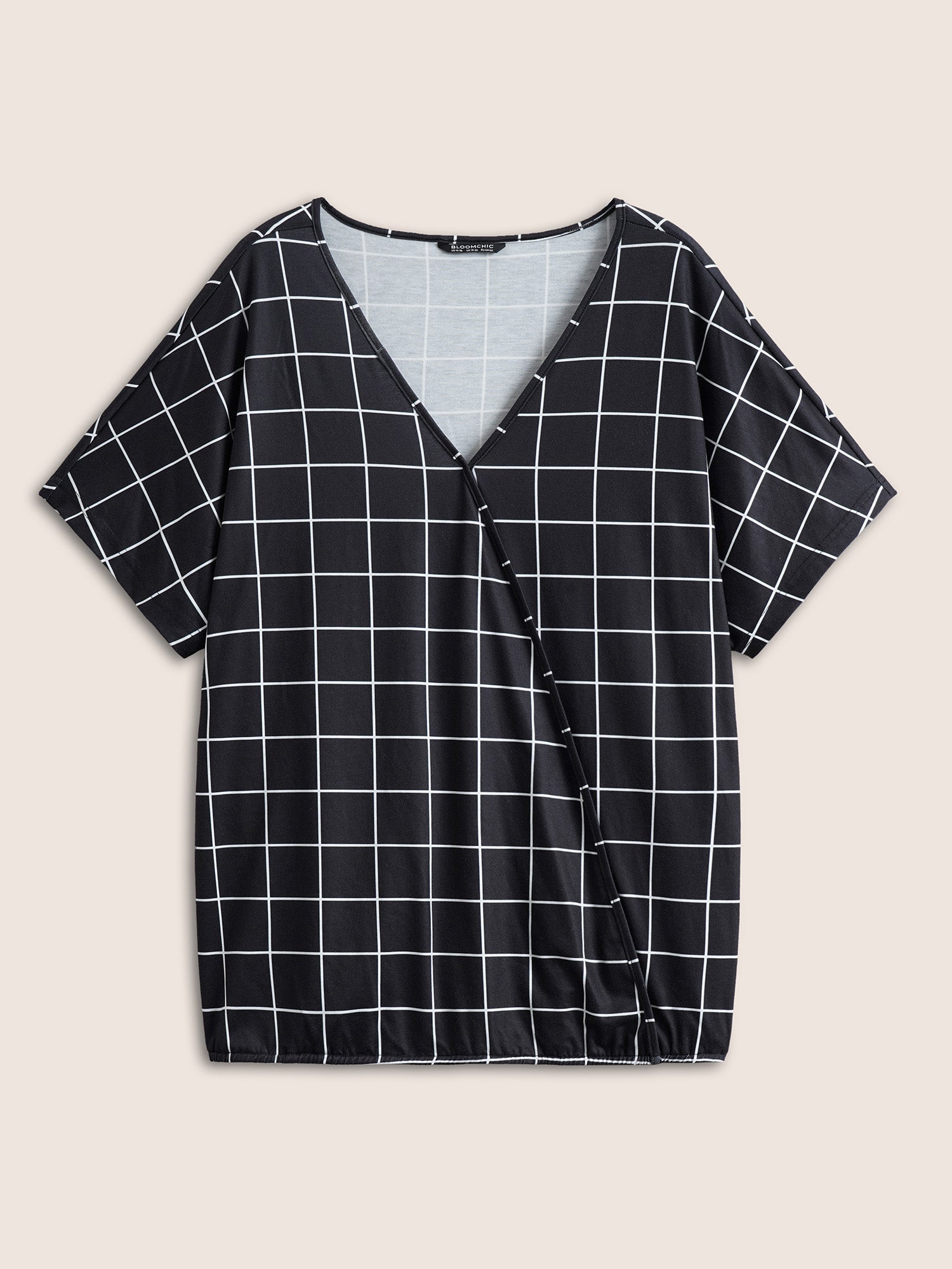 Plaid Surplice Neck Batwing Sleeve T-shirt