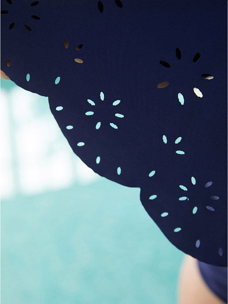 Plain Laser Cut Ruffle Trim Asymmetrical Neck One Piece Swimsuit